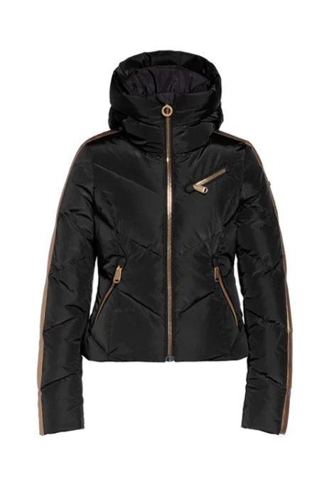 Quilted down jacket with hood and contrast stripes along sleeves.