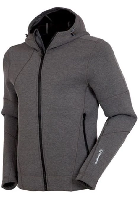 Sunice developed this double-knit softshell hoodie with Technospacer air-chamber technology to achieve thermal insulation in an extra lightweight stretch fabric. It makes a smart, highly breathable performance layer on cool and windy days. Versatile full-zip jacket styling with attached hood and zippered handwarmer pockets. 72% poly, 20% rayon, 8% spandex. Machine wash.